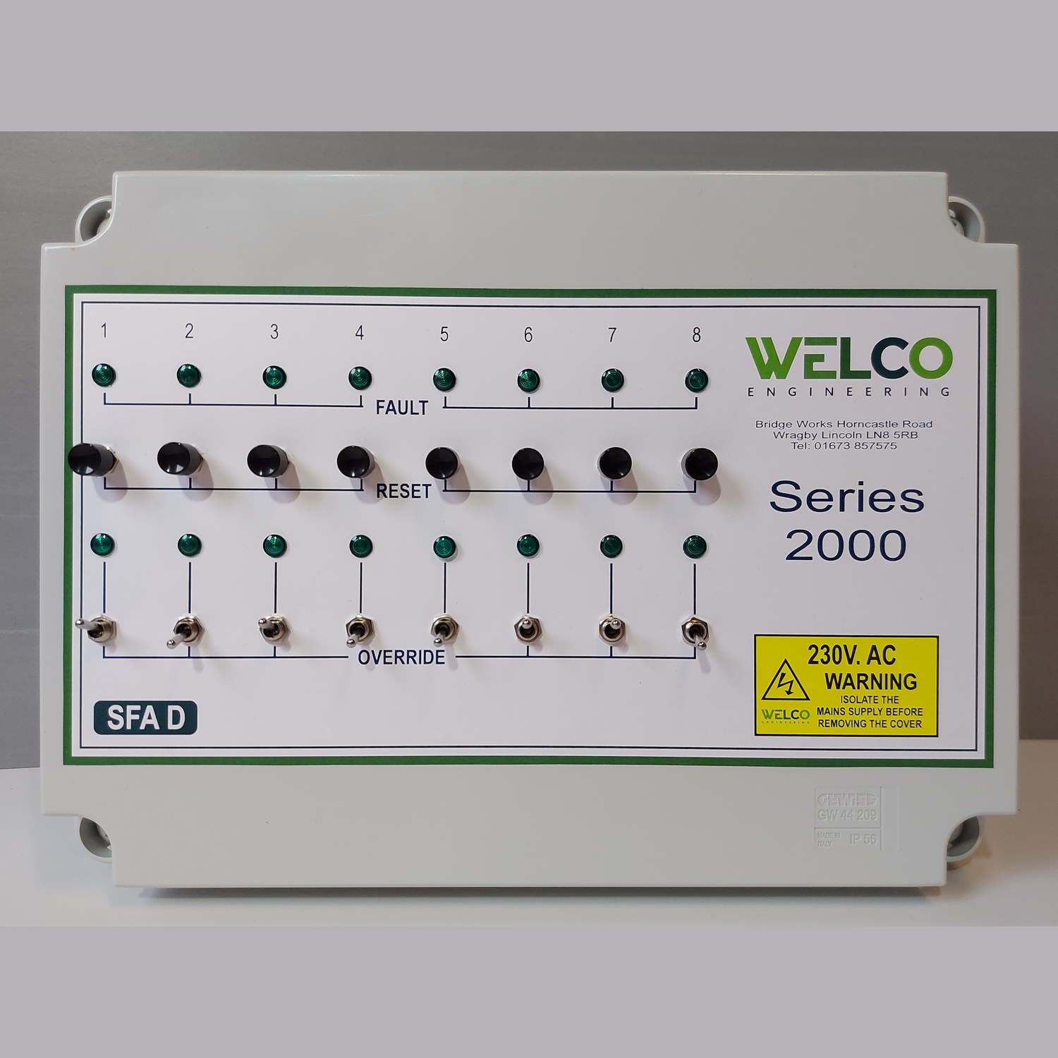 Up to 8 individual channels of detection of various devices i.e. thermostat contacts, intruder switches that open circuits upon dangerous conditions prevailing etc. Used for high and low temperatures, public electricity supply failures, building unauthorised intrusion and high or low water or feed supply conditions. Fault causes operation of output relay contacts and individual LEDs indicate faulty channel or where over ride is applied. Reset is provided by a simple push button. 16 and 24 Channels are available if required.