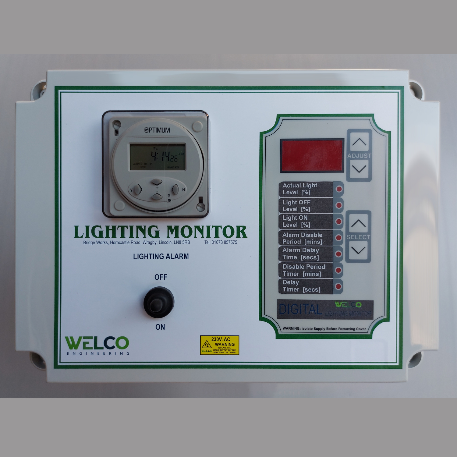 The lighting monitor/alarm senses the actual level of light in the poultry house with a photo cell and detects if the level falls outside that expected at any time during the 24 hour period. If for instance the lights were to fail to turn off at the normal set time, the light detector in conjunction with the built in time clock would signal an alarm.