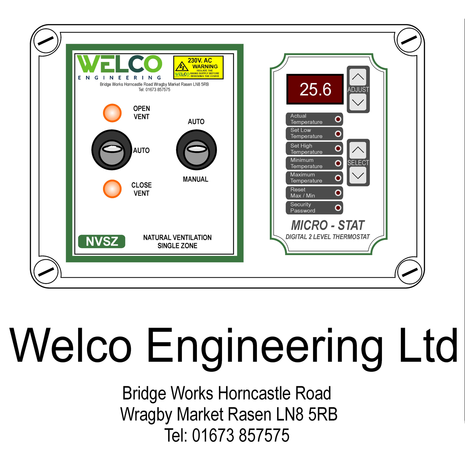 The precision micrcomputer based NVSZ Natural Ventilation Single Zone System designed and manufactured by Welco Engineering Ltd. Provides touch button control of independently adjustable, high and low temperature thermostatically activated output contactors that may operate a motorised ventilator to control the environment temperature over a range of 0-40 degrees C.